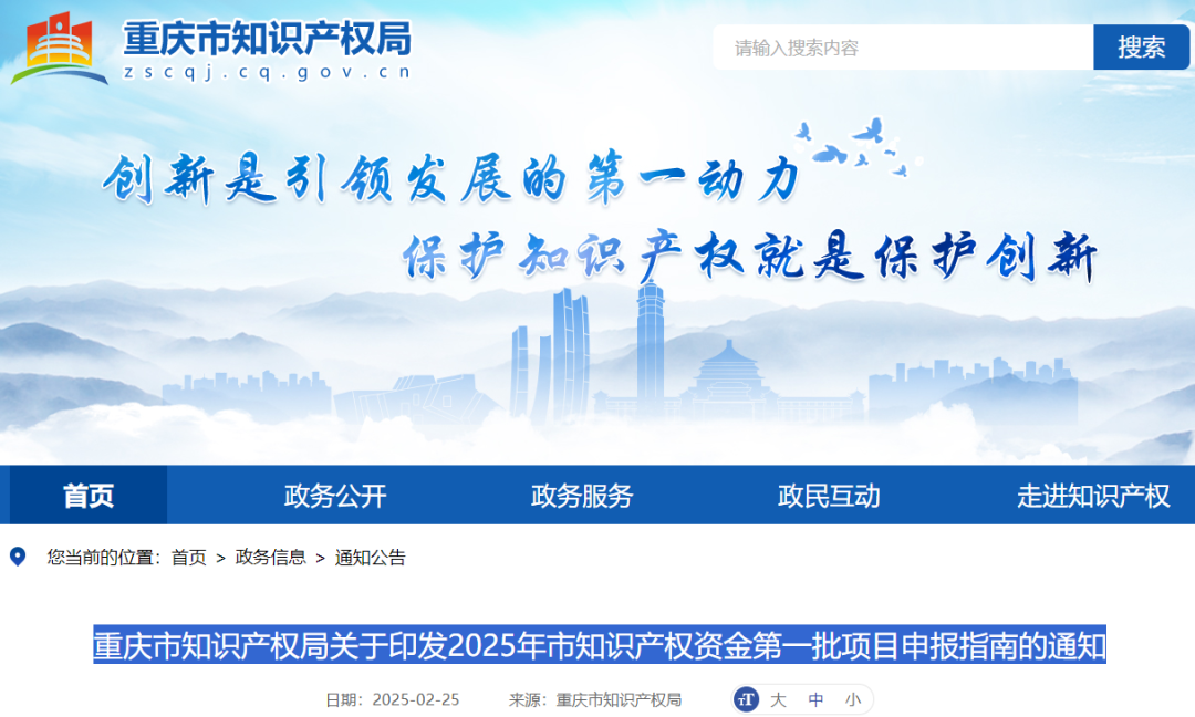 根据《重庆市知识产权局 重庆市财政局关于印发重庆市知识产权专项资金项目管理办法的通知》(渝知发〔2025〕2号)相关要求,市知识产权局决定组织开展2025年市知识产权资金第一批项目申报工作。现将申报指南印发给你们,并就有关申报事项通知如下: