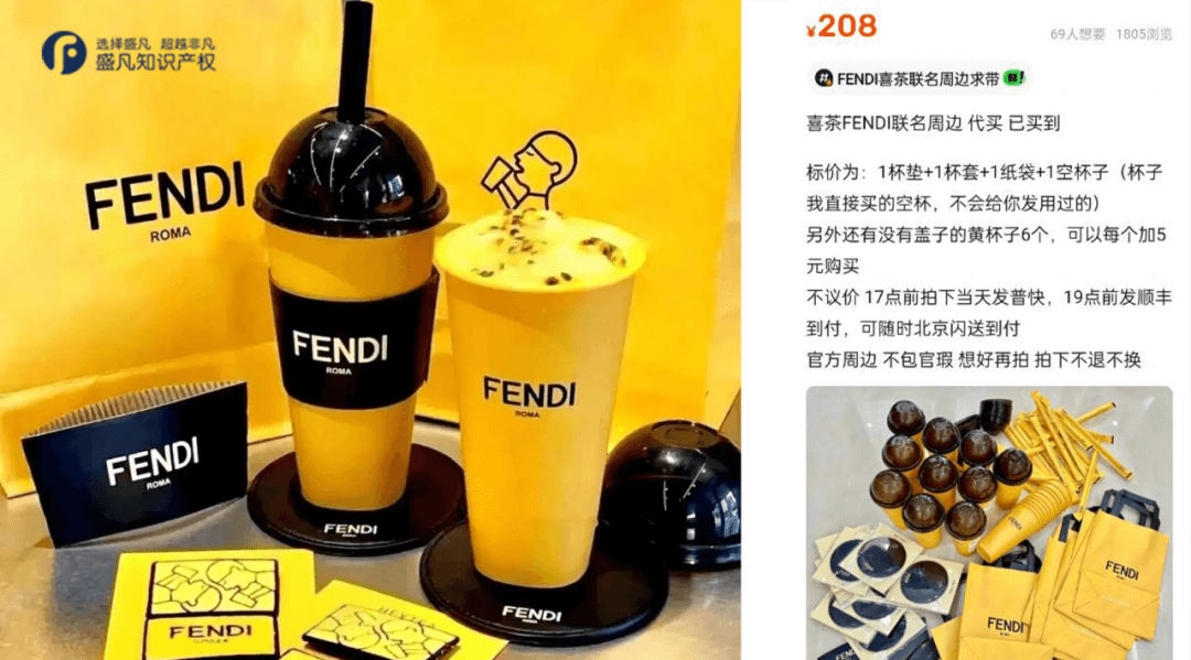 而更早之前,喜茶与奢侈品牌FENDI推出的联名产品及周边则尤为火爆。