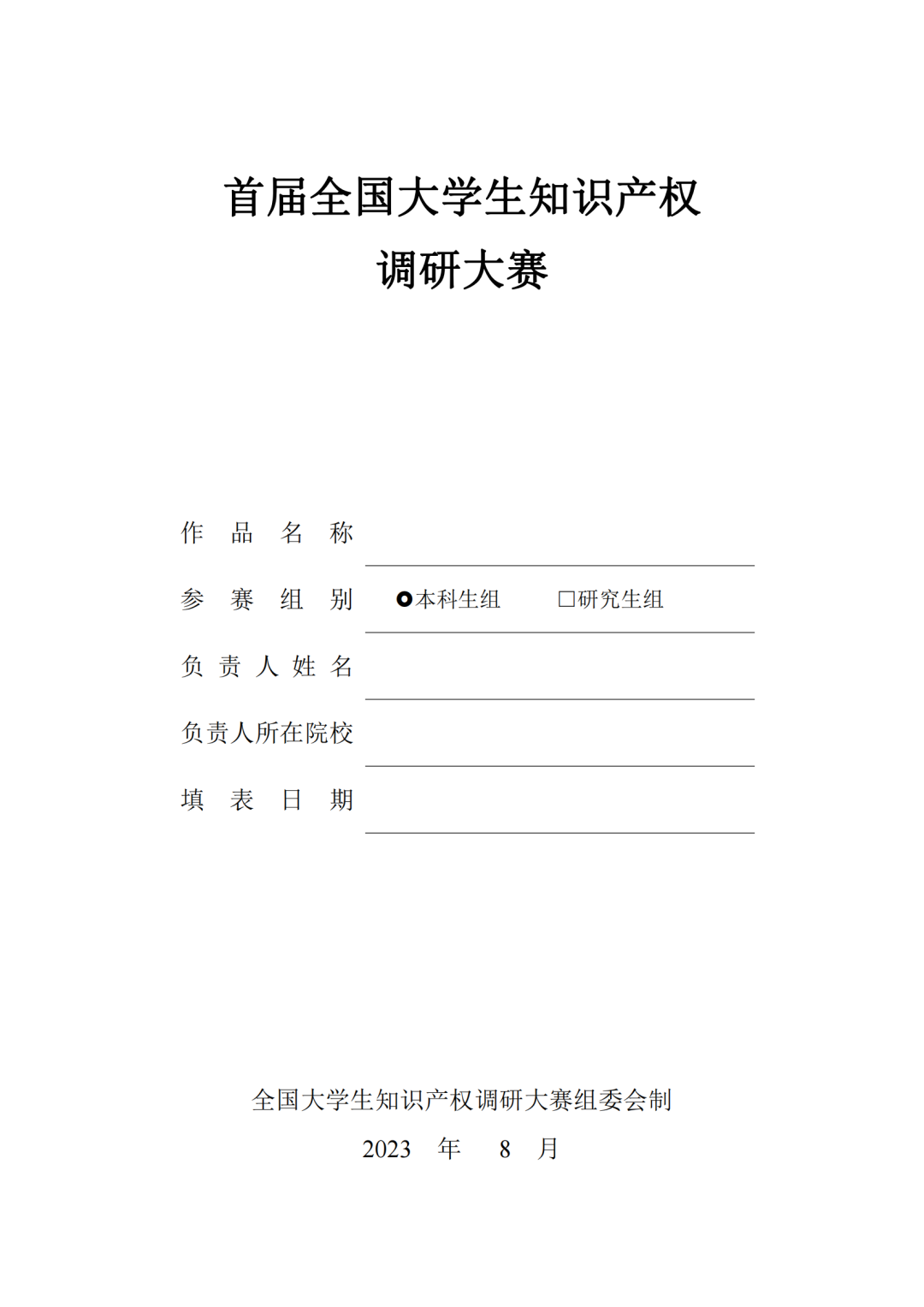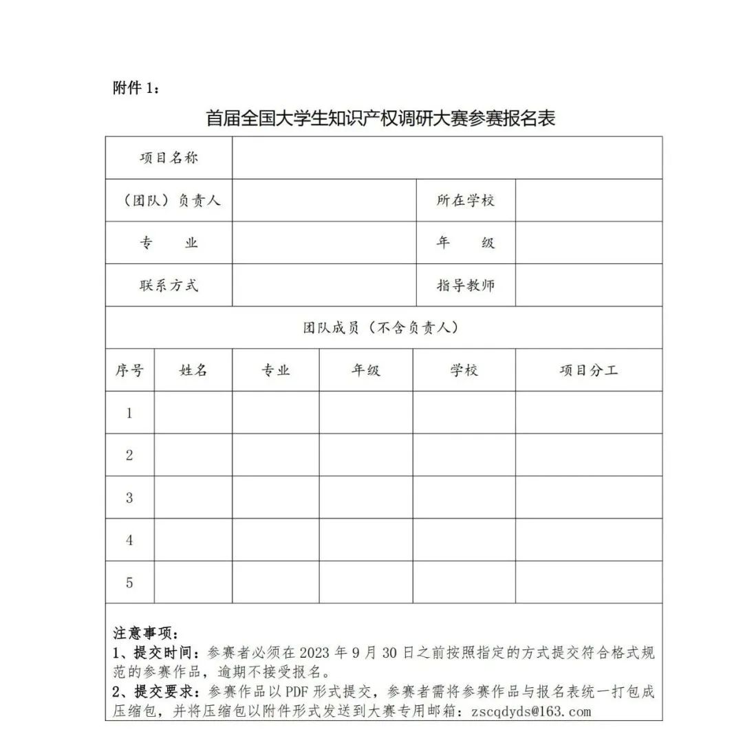 本次大赛采取网上报名方式,参赛者在2023年9月30日前,将报名表(附件1)与参赛作品电子版(PDF格式,统一封面见附件2)以邮件形式发送到大赛专用邮箱zscqdyds@163.com,邮件标题统一格式:知研赛(研或本)+第一作者姓名+第一作者就读学校+调研作品名称。