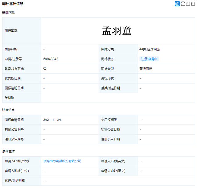 据企查查显示,近日,珠海格力电器股份有限公司申请注册多个“明珠羽童”“孟羽童”“羽童”商标,国际分类含广告销售、科学仪器、方便食品、设计研究、医疗园艺、日化用品等,申请日期为2021年11月24日,当前商标状态均为申请中。