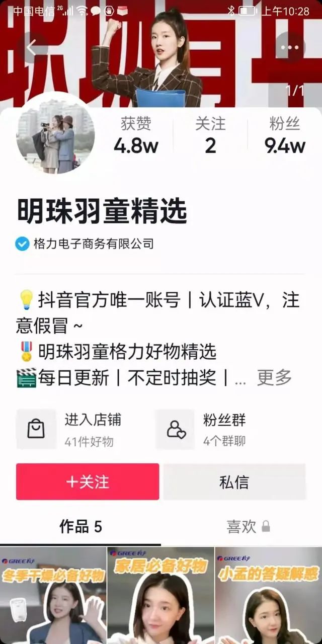 目前,该账号共发布了5个视频。在第一个视频中,孟羽童表示“将在此账号分享格力电器的产品”,其余4个均为孟羽童的带货视频。值得注意的是,目前该账户已有粉丝9.4万(上周六为3.5万),获赞4.8万人次(上周六为2.1万人次)。
