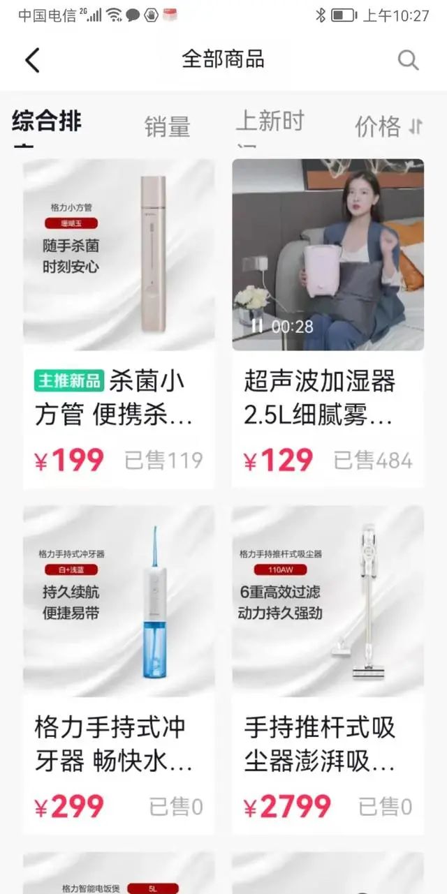 在带货视频中,孟羽童介绍的产品会附上“GREE格力小家电旗舰店”的链接,销量最高的正是孟羽童带货的几款。其中,售价129元的超声波加湿器销量已有484件,售价199元的杀菌小方管销量为119件。其他没有出现在“明珠羽童精选”视频中的电器,销量并不高。