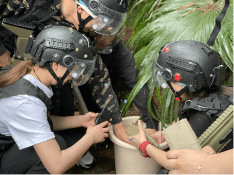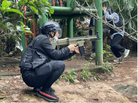 大家陆陆续续随车队到达本次活动目的地——铁山坪极限精英CS俱乐部,到达目的地后简单集合,一首“孤勇者”拉开了本次CS游戏的序幕。由教练将伙伴们分为两支队伍:警察与土匪,并按照不同的组别分发装备、调试装备、教授装备使用情况,并跟大家讲解了游戏规则。小伙伴们相互穿佩戴整齐后,各部门开始凹造型,摆poss。