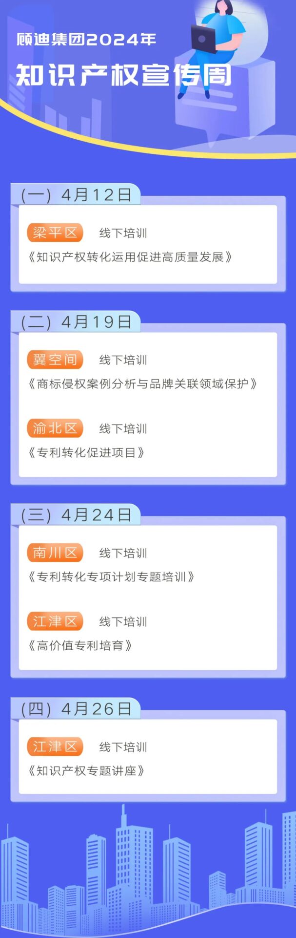 在2024年全国知识产权宣传周期间,顾迪集团紧扣“知识产权转化运用促进高质量发展”这一主题,联合梁平、南川、江津等区县市场监管局、窗口平台、工业园区、众创空间开展了系列内容丰富、精彩纷呈的专题讲座、座谈交流、沙龙活动,线上线下活动参与数累计超3000人次。