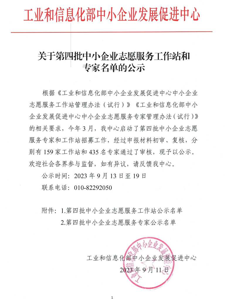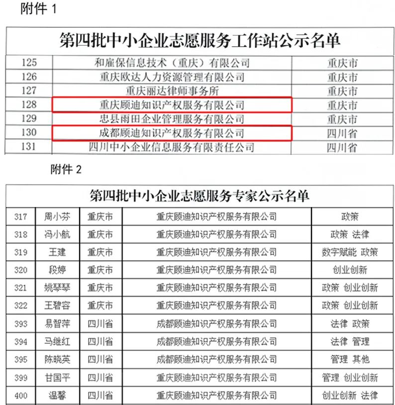 近日,根据《工业和信息化部中小企业发展促进中心中小企业志愿服务工作站管理办法(试行)》的相关要求,为中小企业提供更贴心、实惠的服务,工信部中小企业发展促进中心公示了“第四批中小企业志愿服务专家和工作站”的获评名单。经过申报材料的初审、复核,分别有159家工作站和435名专家通过了审核。其中,“顾迪知识产权(重庆、成都)”荣获第四批中小企业志愿服务工作站称号、11名同志获得工信部认定,成为中小企业志愿者服务专家。