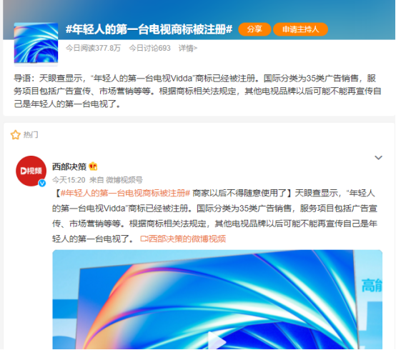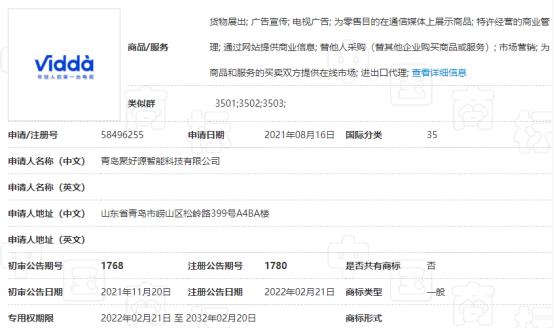 据商标局官网显示“年轻人的第一台电视Vidda”商标已经被注册。商标公告信息显示,年轻人的第一台电视商标注册于2021年8月份,11月初步审定公告,2022年2月商标注册公告。“年轻人的第一台电视Vidda”国际分类为35类广告销售,服务项目包括广告宣传、市场营销等等,目前该公司还在注册该商标名称的其他分类。根据商标相关法规定,其它电视品牌以后可能不能再说自己是年轻人的第一台电视了。