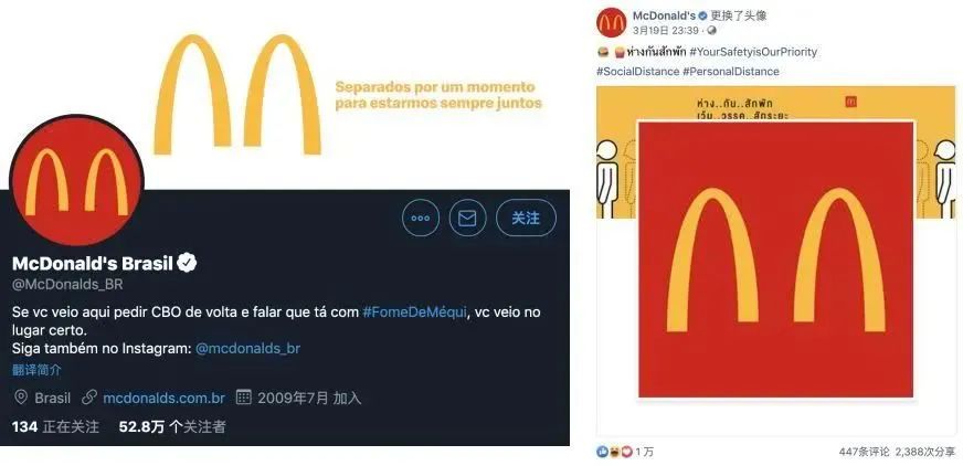 随后,麦当劳在巴西、泰国、埃及、巴基斯坦等地的分公司的社交媒体也纷纷跟进,换上了新的『防疫LOGO』。