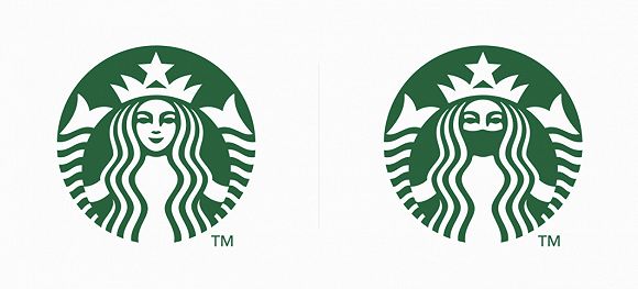 疫情期间,除了麦当劳这样官方将logo分开的,还有不少在社交媒体中引起网友热议的创意,也是将“隔离”应用到logo图案设计中。比如设计师Jure Tovrljan就把不少品牌的logo给隔离了——Mastercard(万事达卡)原本logo是重叠在一起的红色和黄色圆圈,而新设计则是分开的两个圆;而星巴克的美人鱼则戴上了绿色的口罩。