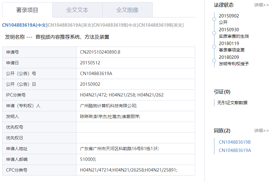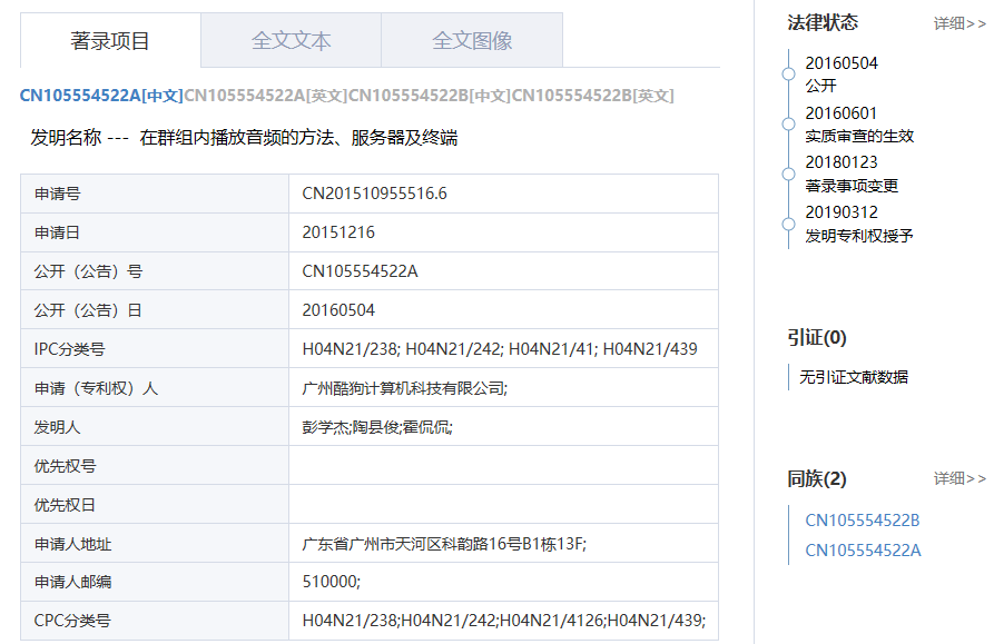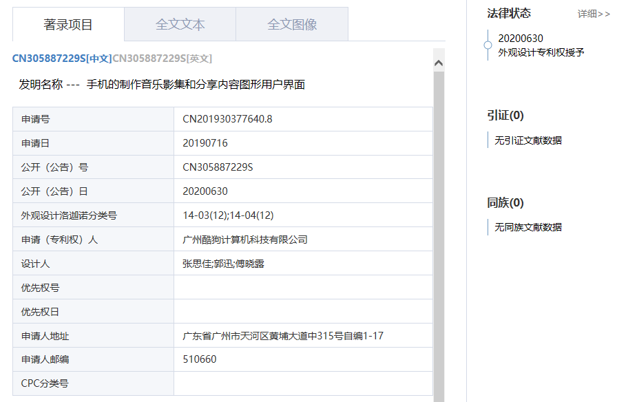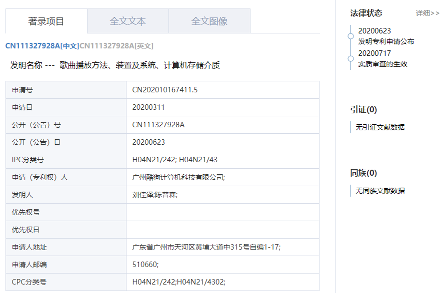 记者通过使用国家知识产权局网站的专利检索功能,发现酷狗音乐回应中提到的三件发明专利中,申请号为CN201510955516.6、CN201510240890.8的两件专利处于有效状态,而申请号为CN202010167411.5的发明专利则处于实质审查阶段,两件申请号为CN201930377640.8、CN202030425482.1的外观设计专利也处于有效状态。