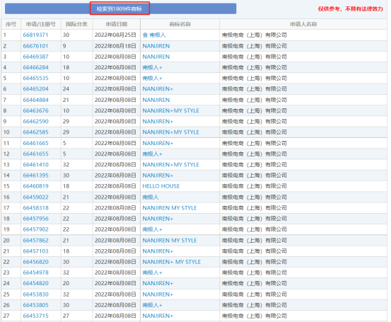 “南极人”前十年在努力打造自己的品牌,后十年在拿自己仅有的商标权疯狂“吸金”。据查询,南极人目前拥有1809枚注册的商标,围绕着“南极人”做了大量的商标防御布局,以中英文两种模式,组合拆分分别做了全类别注册。