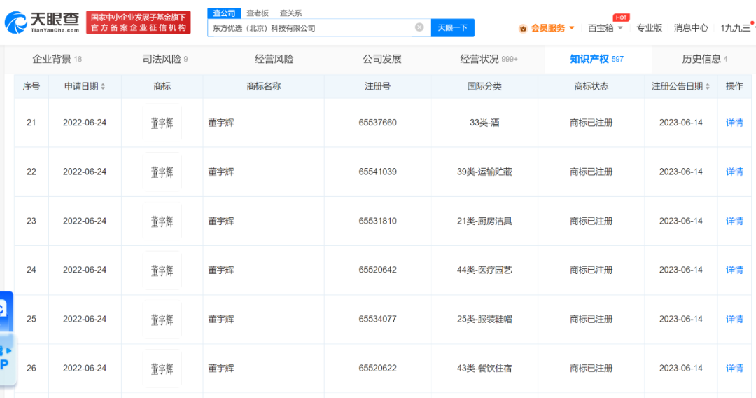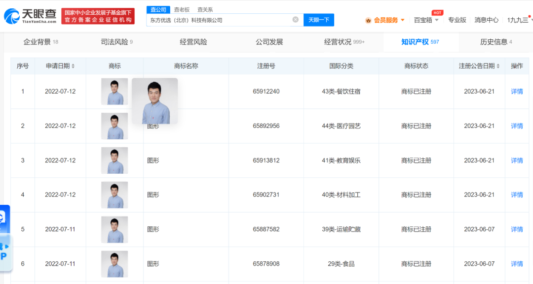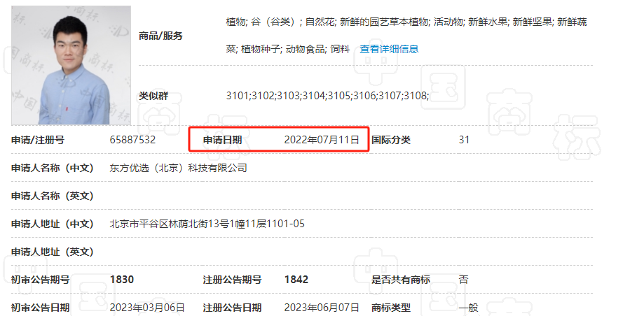 7月6日,根据天眼查APP信息显示,东方优选科技有限公司于2022年6月、7月申请注册多个“董宇辉”文字形象和商标,注册所涉及的分类十分广泛,包括餐饮住宿、医疗园艺、教育娱乐、材料加工、运输贮藏、食品等等。