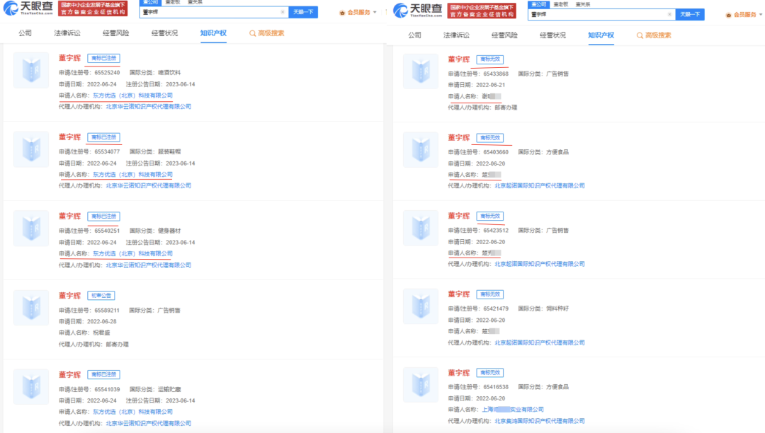 上述商标,除东方优选公司申请的多个“董宇辉”商标已成功注册,其余商标申请大多已被驳回,处于无效状态。