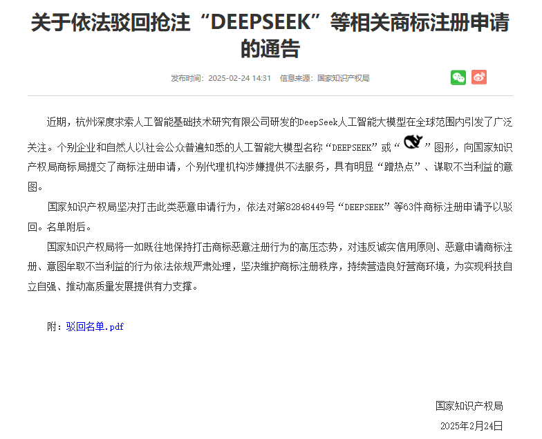 2月24日,国家知识产权局发布通告,依法驳回抢注“DEEPSEEK”等相关商标注册申请。