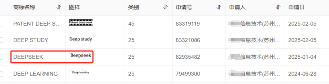 值得注意的是,某信息技术(苏州)有限公司除了在第25类上申请了1件DeepSeek商标,还申请了其他以Deep开头的商标,比如DeepLearning、DeepStudy等;