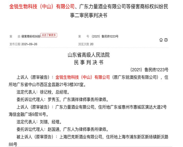 此前,金瑞生物科技与广东力量酒业(起诉方)因不服一审判决赔偿RIO公司(上海巴克斯酒业有限公司)360万元,决定上诉山东省高级人民法院。