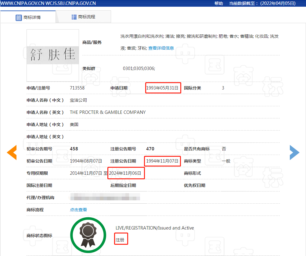 1993年,宝洁公司在第3类“肥皂;香水;洗发液”等商品上申请注册了第713558号“舒肤佳”商标,经续展,商标目前仍在有效期内。