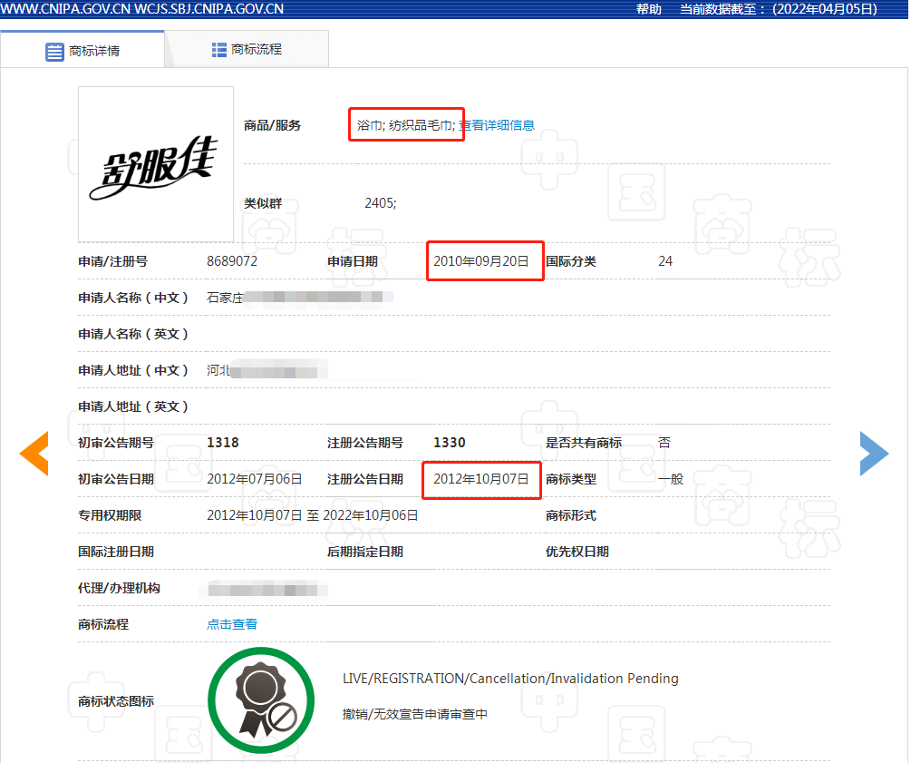 2010年9月份,石家庄某针纺制品公司在第24类“浴巾;纺织品毛巾”商品上申请注册了第8689072号“舒服佳”商标(诉争商标),2012年10月份商标注册公告。