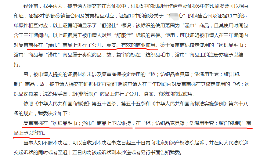 国家知识产权局(原商评委)审理后作出决定:“舒服佳”商标在“毡;纺织品家具罩;洗涤用手套;旗(非纸制)”商品上予以撤销,在“纺织品毛巾;浴巾”商品上予以维持。