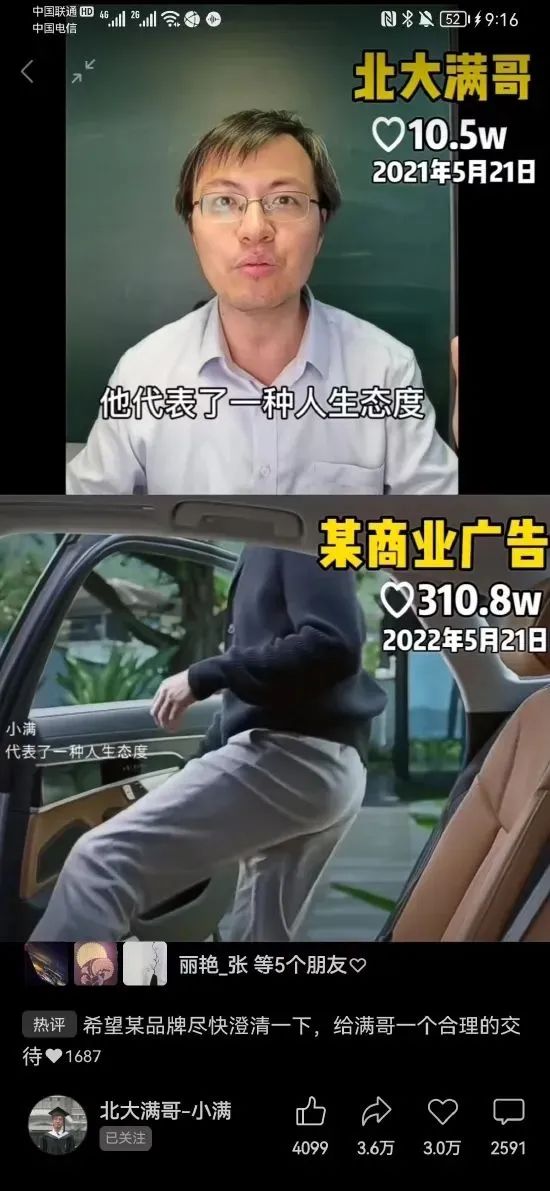 5月21日,奥迪发布的一则“刘德华说小满”的视频在朋友圈刷屏。当晚,拥有300多万粉丝的抖音博主北大满哥,发视频称:奥迪当日发布的一条广告,涉嫌抄袭他在2021年5月21日一条视频的文案。