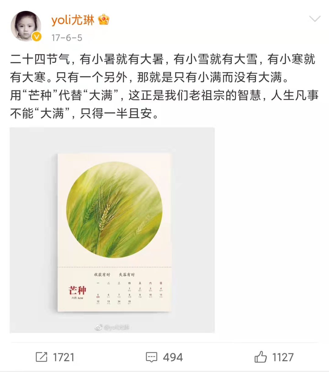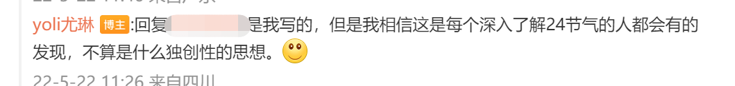 针对网友质疑“北大满哥”疑似抄袭“yoli尤琳”的观点,@yoli尤琳 回应称:每个深入了解24节气的人都会有此发现,不算什么独创性的思想。