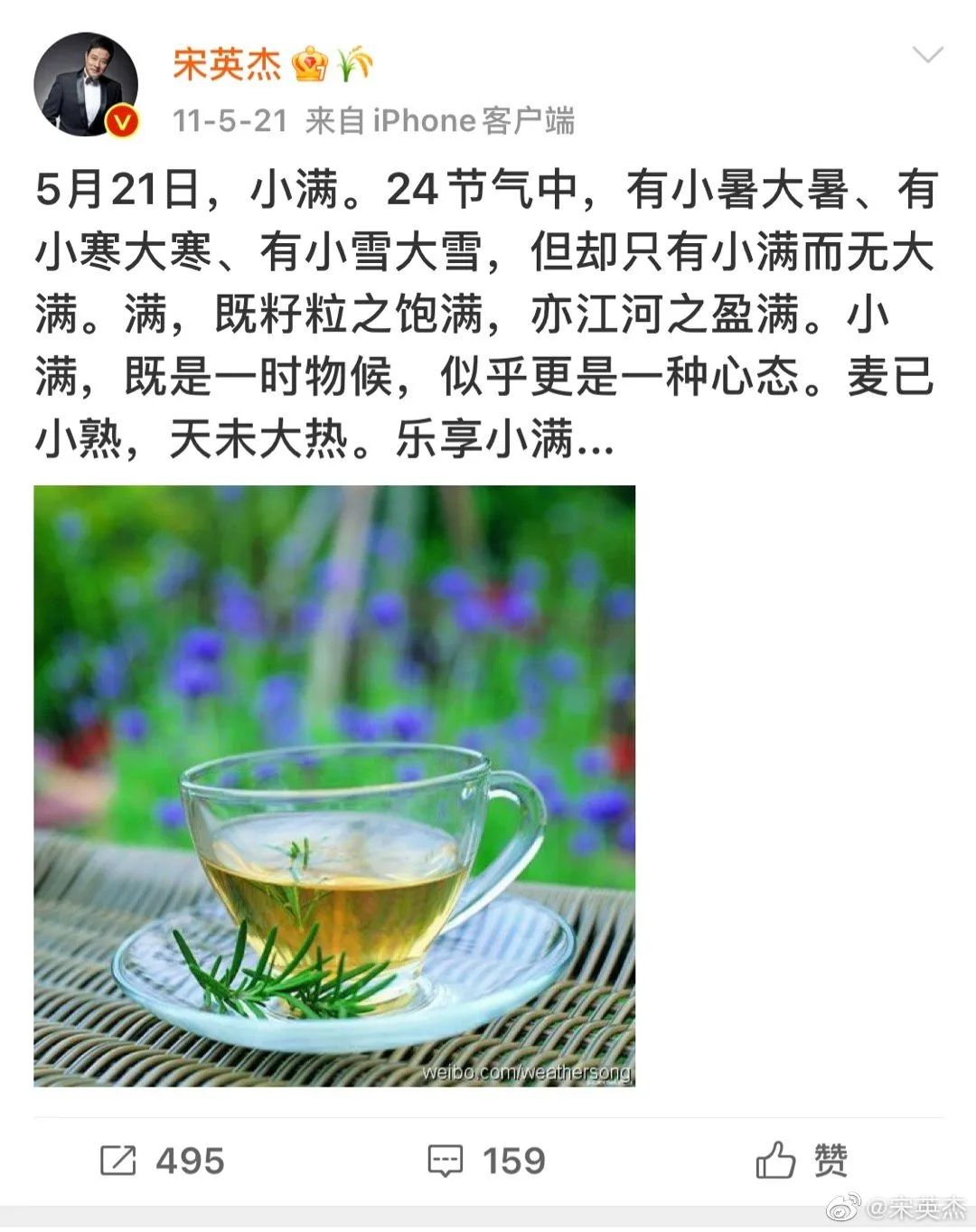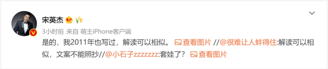 中央电视台天气预报主持人宋英杰也发微博说明,自己曾在2011年发表过类似的解读。不过他也表示,解读可以相似。
