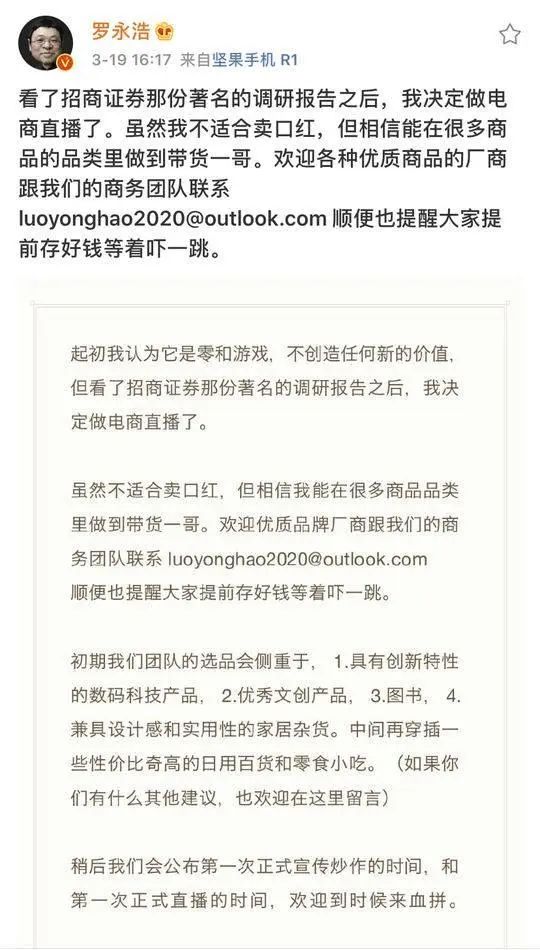 3月19日,罗永浩在微博上说,看了招商证券一份著名调研报告之后,决定做电商直播了,“虽然我不适合卖口红,但相信能在很多商品的品类里做到带货一哥。”