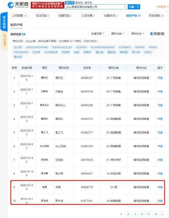 天眼查数据显示,2019年10月16日,“罗永浩”商标被光山县茗阳阁科技有限公司注册,目前状态为等待实质审查,商标分类为烟草烟具。