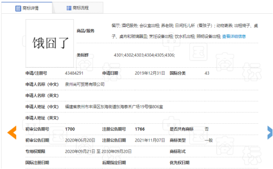 据悉,“饿囧了”商标由泉州某贸易公司申请。