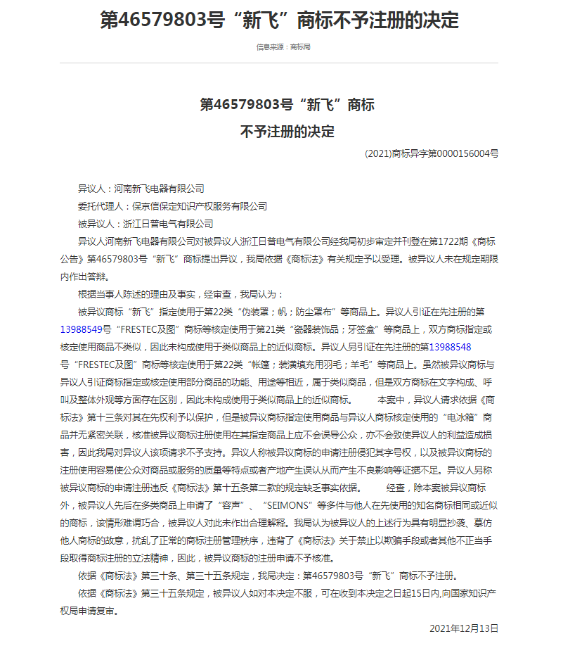 “新飞广告做得好,不如新飞冰箱好”的广告词,是“80后”抹不掉的童年记忆。不过,2017年11月9日,新乡市中级人民法院依法受理新飞电器公司等3家公司的重整申请,随后,新乡市印发了关于”新飞”商标管理办法(试行)的通知,新飞商标仅授权新乡市智能家电专业园内注册并在园区内生产的企业许可使用!近日,一家第三方公司申请新飞商标,进入公示期后,被成功异议!