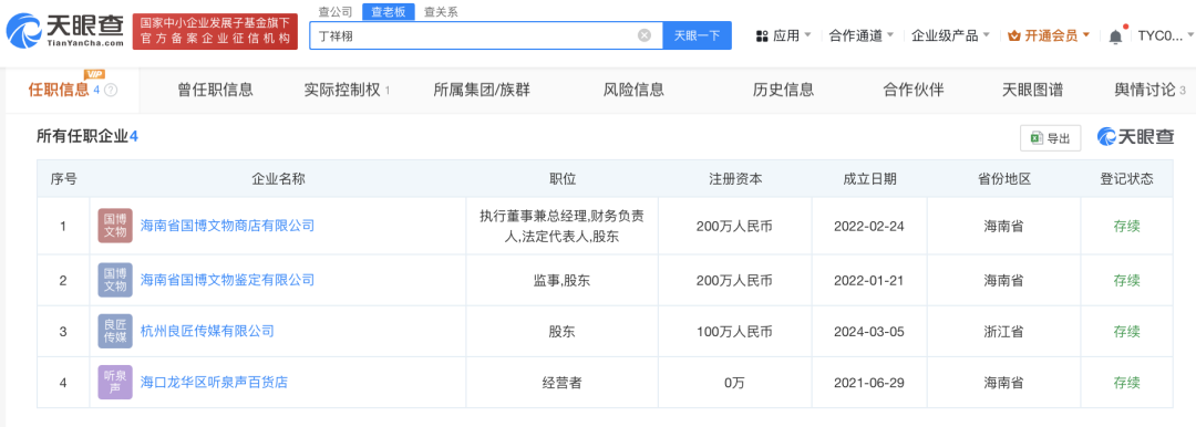 天眼查显示,丁祥栩名下在海南共关联了4家企业,包括海南省国博文物商店有限公司、杭州良匠传媒有限公司、海南省国博文物鉴定有限公司、海口龙华区听泉声百货店,目前均为存续状态。此外,丁祥栩还持有杭州良匠传媒有限公司49%股份。