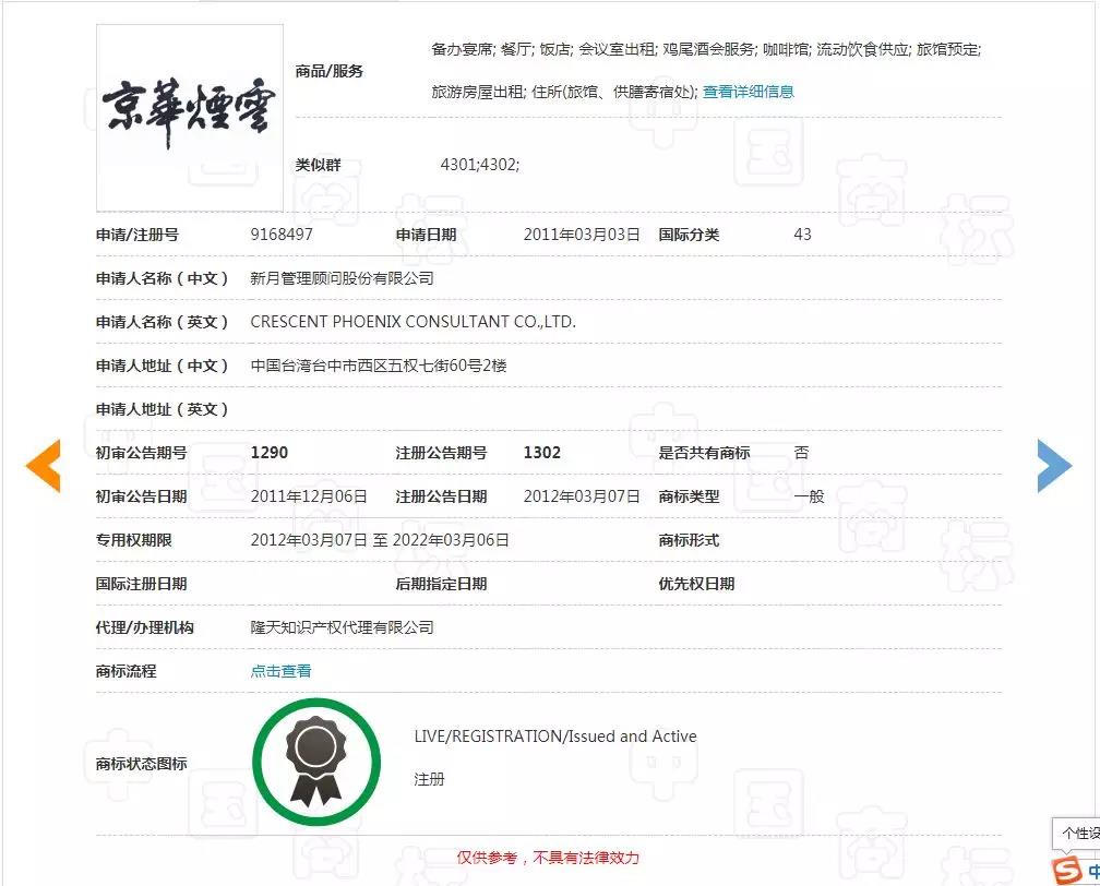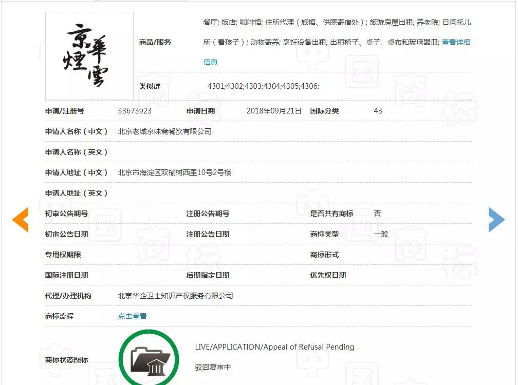 第9168497号“京华烟云”引证商标是新月管理顾问股份有限公司申请于2011年3月3日,申请在第43类“备办宴席; 餐厅; 饭店; 会议室出租; 鸡尾酒会服务; 咖啡馆; 流动饮食供应; 旅馆预定; 旅游房屋出租; 住所(旅馆、供膳寄宿处); ”目前也处于被老城京味斋公司提出撤销申请中。