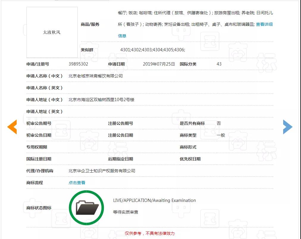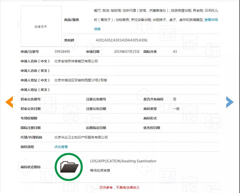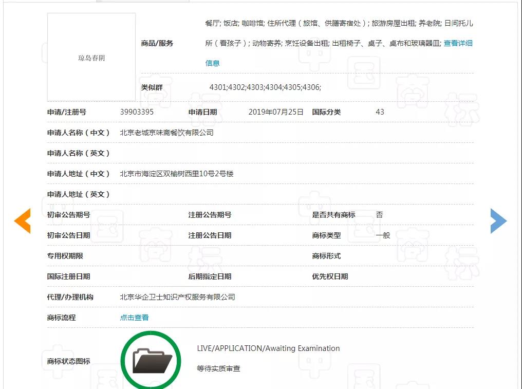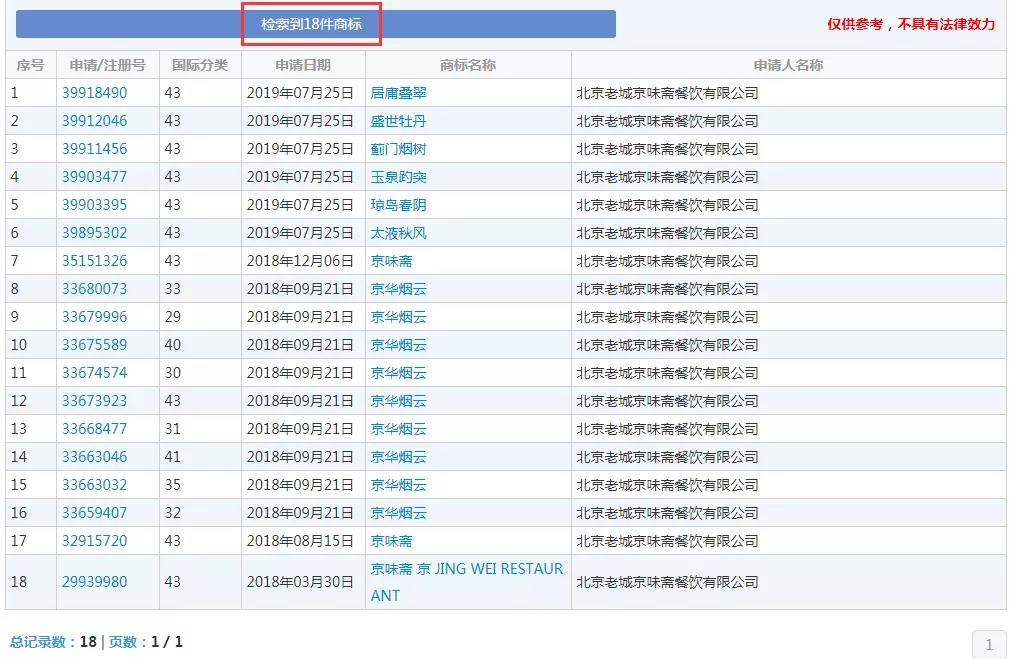 企查查数据显示:老城京味斋公司注册于2005年,从事住宿和餐饮业。商标局网站查询得知,目前公司名下共有申请商标18件,主要集中在第43类,