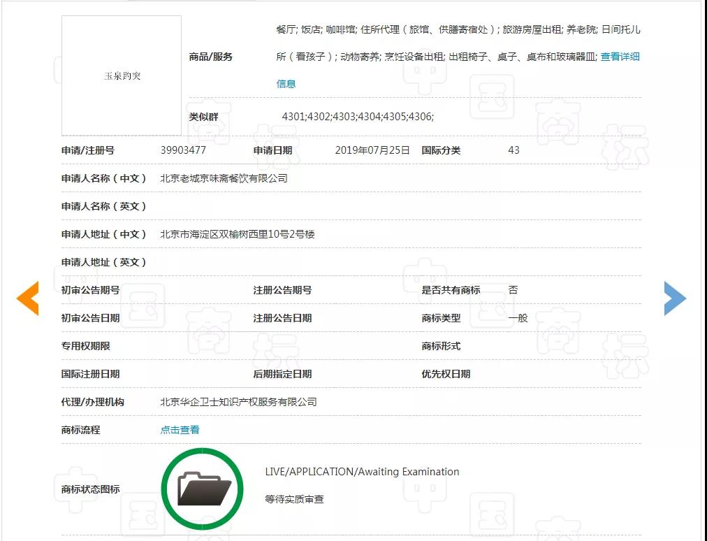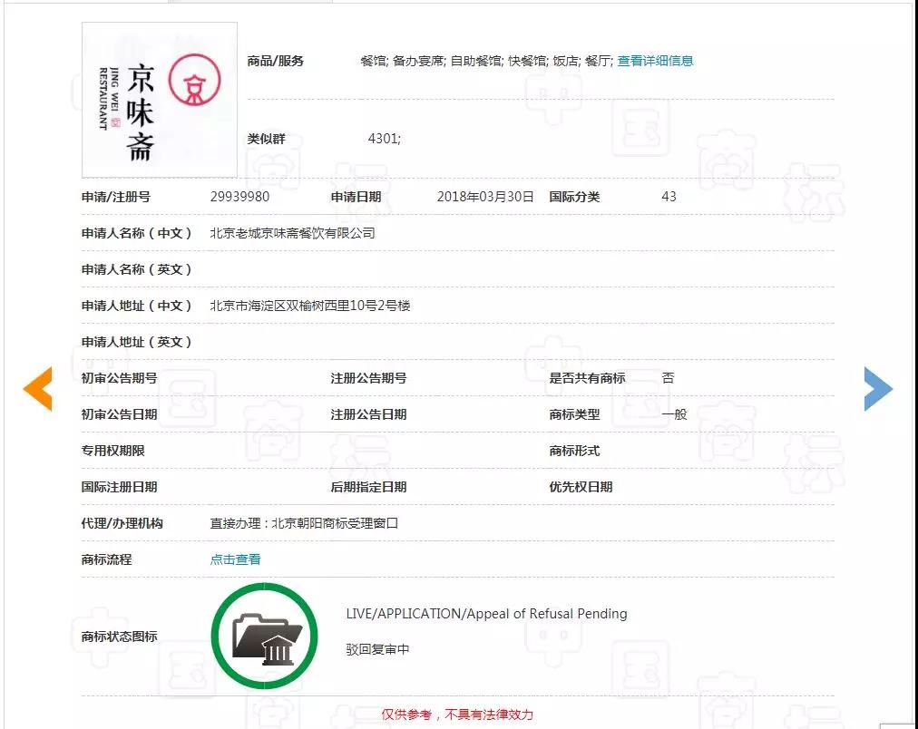 2018年3月30日申请了第一件商标“京味斋”,目前处于驳回复审中。