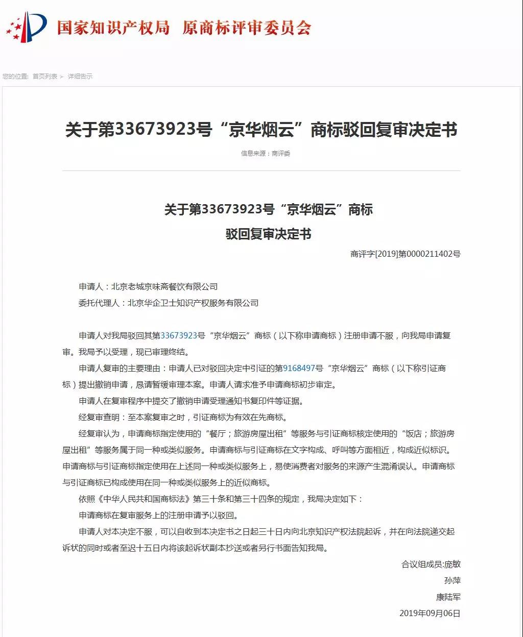 第33673923号“京华烟云”商标驳回复审决定书