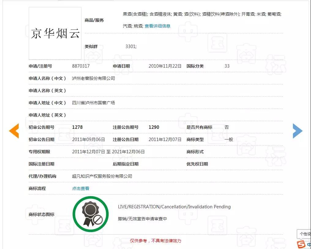 其中,第8870317号“京华烟云”引证商标是泸州老窖股份有限公司申请于2010年11月22日,申请在第33类“果酒(含酒精); 含酒精液体; 黄酒; 酒(饮料); 酒精饮料(啤酒除外); 开胃酒; 米酒; 葡萄酒; 汽酒; 烧酒”,目前被老城京味斋公司提出撤销申请。