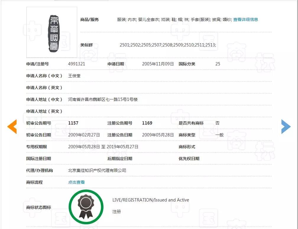 第一件“京华烟云”商标于2005年11月09日申请,目前核准注册在第25类“服装; 内衣; 婴儿全套衣; 戏装; 鞋; 帽; 袜; 手套(服装); 披肩; 婚纱”