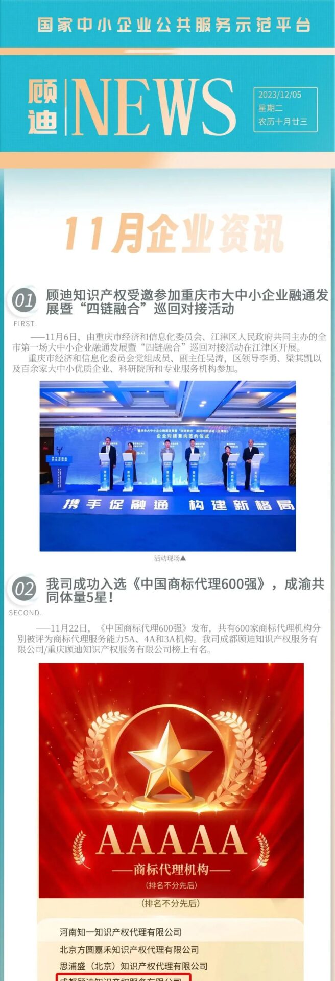 过去的11月,顾迪作为知识产权的品牌服务机构,成绩斐然,成功跻身中国商标代理600强,展示了我们在知识产权领域的强大实力。