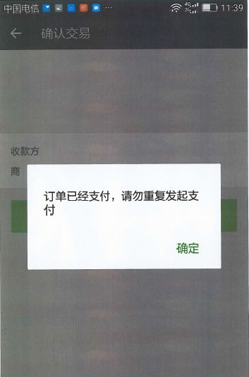 2.微信扫码支付不具有与步骤五、六中“采集”相等同的技术特征:权利要求14的步骤一、二和步骤五、六都限定了“采集”特征,原则上对同一术语在同一权利要求中应当做同样的解释,将其理解为“获取”。微信扫码支付并没有判断第二字段是否被获取过的步骤,只有移动终端用户在扫描二维码的基础上,另行通过输入密码等支付方式实际支付后,订单的状态才会发生变化,如下图提示“订单已经支付,请勿重新发起支付”。