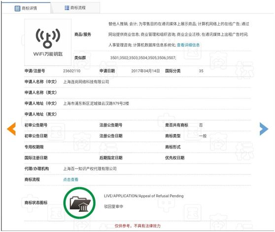 然而在2017年4月连尚公司提出的第23602110号“WiFi万能钥匙及图”商标的注册申请,遭到了连续驳回。
