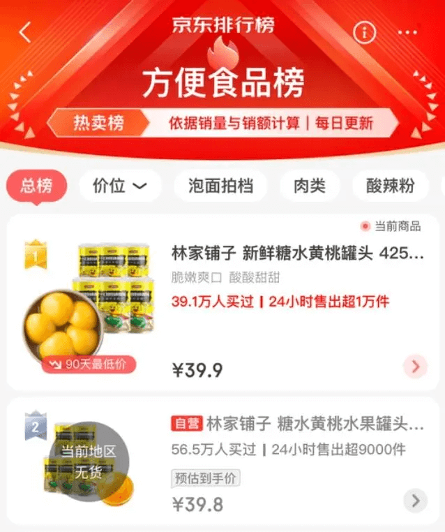 据了解,某家的黄桃罐头还登上了京东方便食品榜榜首,短时间内就有39.1万人购买,24小时买出超1万件,销售量惊人。