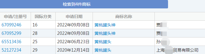据中国商标网查询结果显示,截至目前,共计有2件“黄桃罐头”,2件“黄桃罐头神”商标的申请记录。